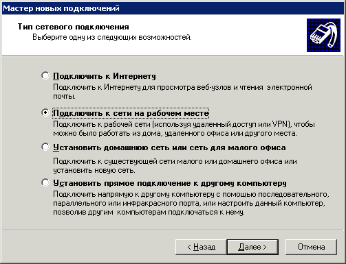 В следующем окне установите переключатель в положение Подключить к сети на рабочем месте