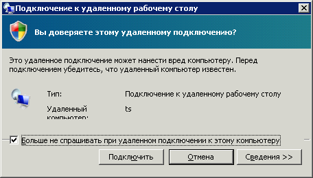 Если появится окно с запросом Вы доверяете этому удаленному подключению?, установите флажок Больше не спрашивать при удаленном подключении к этому компьютеру и снова щелкните Подключить.