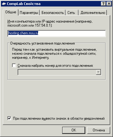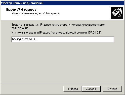 Затем в окне Выбор VPN-сервера введите hosting.chem.msu.ru в поле Имя компьютера или IP-адрес
