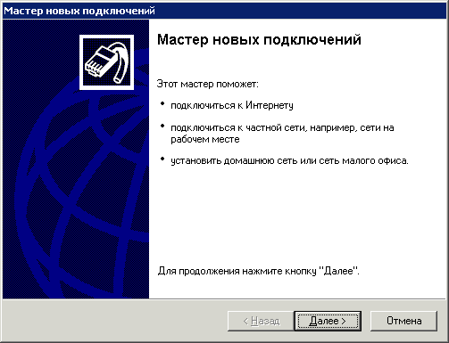 Запустите мастер новых подключений. Для этого на панели задач щелкните Пуск, в открывшемся меню выделите Все программы, затем Стандартные, затем Связь, после чего выберите Мастер новых подключений. Откроется окно следующего вида:
