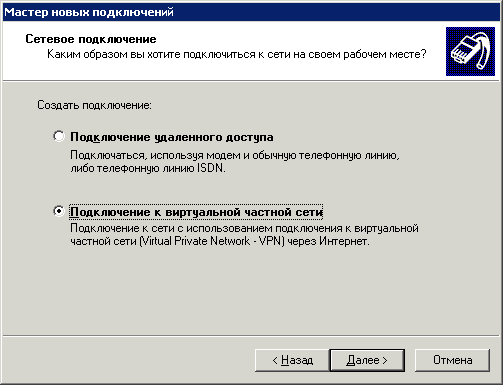 В окне Сетевое подключение установите переключатель в положение Подключение к виртуальной частной сети
