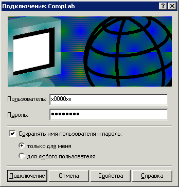 Последовательно нажимая OK, вернитесь к ранее открытому окну Подключение: CompLab, введите в поле Пользователь выданное вам на занятии имя, а в поле Пароль тот пароль, который вы задали для своей учетной записи (обратите внимание, что он не показывается при вводе). Затем установите флажок Сохранять имя пользователя и пароль и щелкните Подключение.