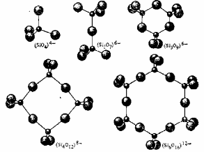 В основе силикатных минералов всегда есть кремнекислородный тетраэдр, т.е. к каждому атому кремния крепится по 4 атома кислорода. Получившиеся отрицательные полюса притягивают катионы. Это силикатно-островная организация (оливин). Еще есть цепочечная организация, когда некоторые кислороды принадлежат сразу двум тетраэдром (авгит). Когда почти все кислороды принадлежат двум тетраэдрам - это ленточная организация (роговая обманка). Если в одной плоскости все кислороды принадлежат двум тетраэдрам – это слоистые минералы (слюда). В каркасных минералах связаны все кислороды (кварц)