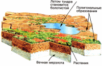 Из-за промерзания после оттаивания начинается промерзание сверху, лед занимает больше места, чем вода, и часть грунта выдавливается, образуя бугорковую тундру (полигональные образования):