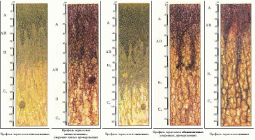 При движении с севера на юг сменяют друг друга оподзоленный, выщелоченный, типичный ("идеальный"), обыкновенный и южный черноземы.