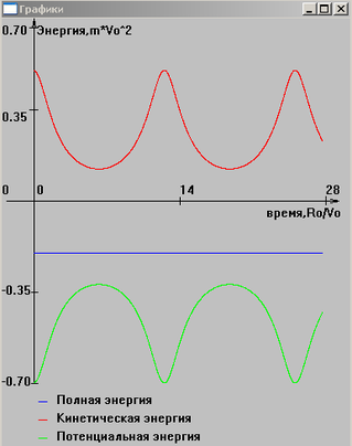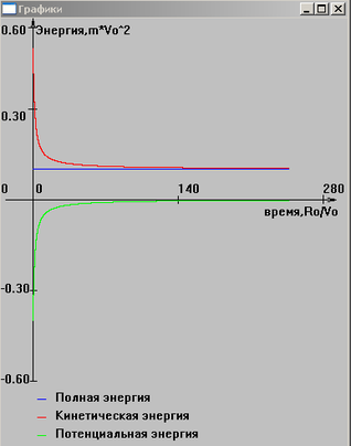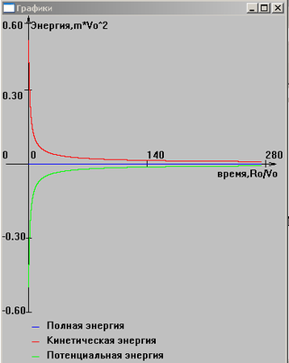 На рисунках 11,12,13 представлены графики зависимости энергии от времени при различных значениях полной энергии. На них видно выполнение закона сохранения полной энергии. При более детальном изучении, установлено, что полная энергия меняется примерно на 10-9 % за период (в случае движения по эллипсу). Это связано с погрешностью численного метода и ошибкой округления.