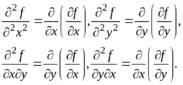 есть функции от переменных x и y. Назовём по определению вторыми частными производными функции