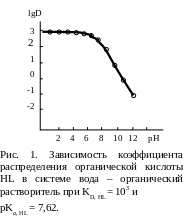 (Вопрос 16). Влияние рН на экстракцию по-разному проявляется для разных групп неионизованных соединений, например полициклических ароматических соединений не зависит от рН. Экстракция органических кислот или фенолов растет с уменьшением рН, достигая максимального значения при рН pKa 2, тогда как при рН pKa 2 переход таких соединений в органическую фазу становится невозможен, так как они находятся в водной фазе в ионизированной форме. Коэффициент распределения органических кислот связан с концентрацией ионов водорода в водной фазе следующей формулой: