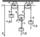 ) Инерциальную систему отсчёта, свяжем с Землёй. Начало одномерной системы координат совместим с центрами неподвижных блоков.б) Так как блоки по условию задачи невесомы, то сила натяжения нити будет постоянна по величине вдоль всей нити.