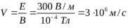 Однородное электрическое (Е = 300 В/м) и магнитное (В = 10-4 Тл) поля направлены взаимно перпендикулярно. Каковы должны быть направление и величина скорости электрона, чтобы его траектория была прямолинейной?