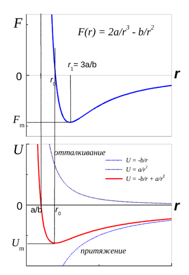 В положении равновесия, действующая на частицу сила должна быть равна нулю. Приравнивая к нулю выражение в скобках, получаем соответствующее равновесное расстояние: