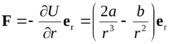 где a и b – положительные константы. а) Найти значение r0, соответствующее равновесному положению частицы, б) выяснить, устойчиво ли это положение, в) найти максимальное значение силы притяжения, г) изобразить графики зависимости U(r) и Fr(r) – проекции силы на радиус-вектор r.
