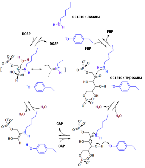Рис. 2. Схема каталитического действия альдолазы класса I.