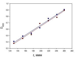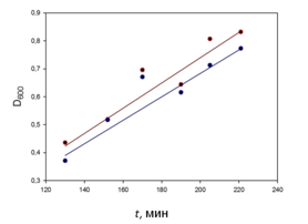 | Рис. 3. Рост клеток нативного штамма E.coli (красными кружочками) и ΔfbaB в нормальных условиях (а) и при рН 6,1 (б). | |