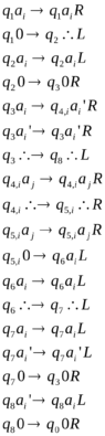 ). Занумеруем буквы, состояния и сдвиги следующим образом: