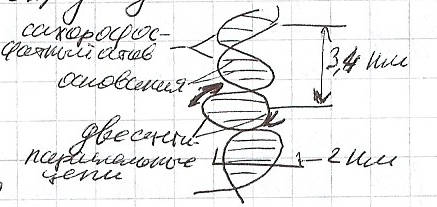 ДНК состоит из двух полинуклеотидных цепей. Каждая цепь закручена в спираль вправо, и обе они свиты вместе, т.е. закручены вправо округ одной и той же оси, образуя двойную спираль: