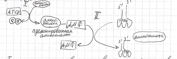 1. Аминокислота активируется, взаимодействуя своей карбоксильной группой с АТФ. Образуется аденимированная (???) аминокислота.