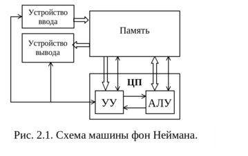 На рис. 2.1 приведена схема машины фон Неймана, как она изображается в большинстве учебников, посвящённых архитектуре ЭВМ. На этом рисунке толстыми стрелками показаны потоки команд и данных, а тонкими – передача между устройствами управляющих сигналов. Машина фон Неймана состоит из памяти, устройств ввода/вывода и центрального процессора (ЦП). Центральный процессор, в свою очередь, состоит из устройства управления (УУ) и арифметико-логического устройства (АЛУ). Рассмотрим последовательно устройства машины фон Неймана и выполняемые ими функции.