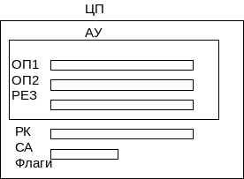 Здесь КОП – код операции (указывает, какую машинную операцию надо выполнить); А1, А2, А3 – адреса первого, второго операндов и результата. Разрядность адресов совпадает с разрядностью регистра СА и определяется объемом ОП (а именно, количеством возможных адресов). Количество разрядов в регистрах ОП1, ОП2, РЕЗ и РК должно совпадать с количеством разрядов ячейки ОП, так как в ОП1, ОП2 и РЕЗ должны поместиться числа, а в РК – команда, которые занимают по одной ячейке ОП.