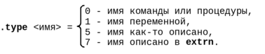 Некоторые характеристики имени можно получить также, применив к этому имени одноместный оператор Ассемблера .type. Результатом работы этого оператора является целое значение в формате байта (i8), при этом каждый бит в этом байте, если он установлен в "1", указывает на наличие некоторой характеристики имени. Ниже приведены номера некоторых битов в байте, которое этот оператор вырабатывает, будучи применённым к своему имени-операнду (напомним, что биты в байте нумеруются справа-налево, начиная с нуля):