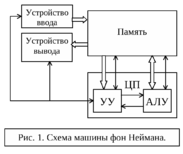 На рис. 1 приведена схема машины фон Неймана, как она изображается в большинстве учебников, посвящённых архитектуре ЭВМ. На этом рисунке толстыми стрелками показаны потоки команд и данных, а тонкими – передача между устройствами управляющих сигналов. Машина фон Неймана состоит из памяти, устройств ввода/вывода и центрального процессора (ЦП). Центральный процессор, в свою очередь, состоит из устройства управления (УУ) и арифметико-логического устройства (АЛУ). Рассмотрим последовательно устройства машины фон Неймана и выполняемые ими функции.