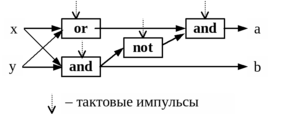 Каждый вентиль срабатывает (т.е. преобразует входные сигналы в выходные) не всё время, а только тогда, когда на вентиль по специальному управляющему проводу приходит так называемый тактовый импульс.
