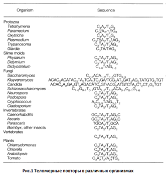 Теломеры дрожжей Saccharomyces cerevisiae, характеризуются гетерогенными нерегулярными повторами, последовательность которых сокращенно можно записать как G1-3T или G2-3(TG)1-6 [4, 5]. Это отличие обусловлено, по всей видимости, неточным копированием матричного участка дрожжевой теломеразной РНК (TLC1). Гетерогенные теломерные повторы являются особенностью не только теломер Saccharomyces cerevisiae, они свойственны также большинству других дрожжей рода Saccharomyces, а, корме того, многим систематически более отдаленным дрожжам, таким как Kluyveromyces lactis и Candida albicans. Необходимо также отметить, что теломерные повторы дрожжей порой могут состоять из большого числа нуклеотидов (до 26). Гетерогенность дрожжевых теломерных повторов оказалась свойством, которое удалось использовать экспериментально и с его помощью продемонстрировать, что концы дрожжевых хромосом имеют очень динамическую структуру. В процессе анализа нуклеотидных последовательностей дрожжевых теломер было обнаружено, что последние 40-100 нуклеотидов на самом конце хромосом характеризуются большой вариабельностью, проявляющейся по истечении одного или нескольких клеточных циклов. Тот факт, что эта вариабельность полностью исчезает при выключении в клетках Saccharomyces cerevisiae теломеразной активности, указывает на то, что синтез теломерных повторов идет лишь на самом крайнем участке хромосом. Причем, длинна этого участка намного больше, чем можно было бы ожидать, исходя из предположения, что теломераза компенсирует утраченные в процессе репликации нуклеотиды (3-5 за клеточный цикл). Оказалось, что теломераза действует крайне избирательно, удлиняя только самые короткие теломеры в пределах одной клетки. В заключение можно сказать, что баланс между укорочением теломеры и ее теломеразным удлинением есть процесс крайне сложный и тонкорегулируемый, все подробности которого до сих пор не ясны.