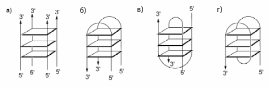 разному может располагаться в полученном квадруплексе. Как видно на рисунке, одноцепочечная ДНК может располагаться параллельно друг другу (a); иметь вид двух параллельных друг другу «петель» (б); двух диагональных и противонаправленных петель по диагоналям (в); унимолекулярный G-квадруплекс, где одноцепочечная ДНК располагается в виде диагональной петли (г).