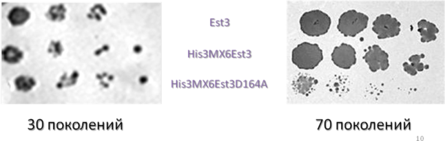 Была получена серия чашек Петри с колониями дрожжей, посаженными в капле среды, концентрация которой менялась последовательными разведениями. Предварительно, клетки растили в течении от 10 до 100 поколений после замены гена Est3 на хромосоме. Ниже показана чашка Петри (рисунок слева) с клетками, которые предварительно растили в жидкой среде в течении 30 поколений (менее 50 поколений, то есть до наступления сенессенса). Колонии клеток в последовательных разведениях выглядят одинаково для всех штаммов. Рядом (рисунок справа) показана чашка Петри с клетками, которые предварительно растили в жидкой среде в течении 70 поколений с того же момента (более 50 поколений, то есть после наступления сенессенса).