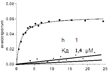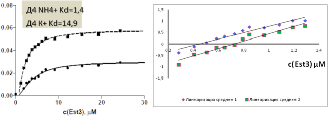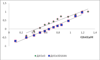 Для доказательства специфичности взаимодействия Est3 с G-квадруплексами проводили измерения анизотропии флуоресценции в различных случаях. В первой серии опытов белок Est3 взаимодействовал с Д4 NH4+ квадруплексом (1). Во второй серии опытов проводили взаимодействие с одноцепочечным олигонуклеотидом Д4 (2). В третьей серии опытов проводили взаимодействие с нетеломерным олигонуклеотидом (3). Ниже представлен график, полученный при обработке выходных данных. Как видно, взаимодействие наблюдается только для G-квадруплекса, при этом константа диссоциации комплекса равна 1,4 мкМ. Взаимодействия в двух других случаях не наблюдалось. Тем самым доказали специфичность взаимодействия с квадруплексами.