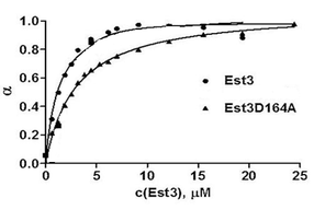 Для выяснения, приводит ли отсутствие взаимодействия Est3 с ДНК G-квадруплексами к нарушению работы теломеразы, был выбран мутантный аналог Est3D164A, экспресированный по гену Est3 приводящим к изменению последовательности белка с заменой 164 аспарагиновой кислоты на аланин. Оказалось, что белок дикого типа взаимодействует лучше, чем белок мутантного типа. Увеличение константы диссоциации в 3 раза для мутантной форсы может быть одной из причин нарушения работы теломеразы. Недавно было показано, что Est1 способен сворачивать ДНК-квадруплесы. Таким образом, логичным является предположение, что Est3 связывается и стабилизирует G-квадруплексы, образованные Est1 для нормальной работы теломеразы.