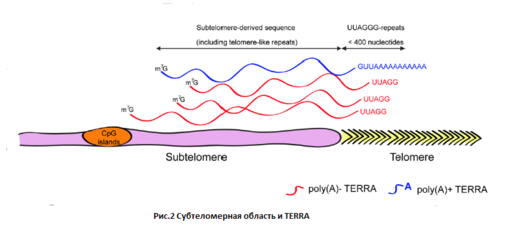 е смотря на то, что теломеры являются гетерохромосомной структурой, недавние исследования показали, что эукариотическая теломера все же подвергается процессу транскрипции при помощи ДНК-зависимой полимеразы PolII. Итогом этого процесса выступает молекула TERRA (TElomeric Repeat-containing RNA), содержащая теломерные повторы. TERRA транскрибируется с нескольких, может быть всех, хромосомных концов комплементарной цепи, начиная с субтеломерной области в направлении концов хромосом. Ядерная локализация TERRA и ее ассоциированность с теломерами указывает на то, что TERRA не транслируется, но при этом выполняет какую-то роль в теломерных гетерохроматиновых структурах. Достоверно известно, что TERRA в определенных обстоятельствах мешает процессу полуконсервативной репликации теломерной ДНК. Однако, транскрипция TERRA с теломерной ДНК может глобально регулировать работу фермента теломераза, а, следовательно, длину индивидуальных теломер на хромосомах, поскольку TERRA оказывает ингибирующее воздействие на теломеразу. Возможно, это обстоятельство как-то связано с тем, что в клетке в среднем удлиняются теломеры, которые короче чем ближайшие соседи в пределах одной клетки.Как известно, теломеры сами по себе образуют различные структуры (t-петли, G-квадруплексы), которые активно мешают процессу репликации. Известно также, что в субтеломерных областях существуют области, богатые С (CpG strands). С этими областями TERRA может связываться и закрепляться на хромосоме. Далее TERRA, предположительно, образует межмолекулярные G-квадруплексы с теломерной ДНК, что отрицательно сказывается на процессе репликации. Действительно TERRA накапливается в ранней G1-фазе и ее концентрация падает к S-фазе, а самый минимум концентрации TERRA приходится на период от S-фазы до G2-фазы [10]. Известно также, что хеликаза UPF1 также регулирует распространенность TERRA [11] (в местном масштабе хеликаза UPF1 может разлагать TERRA для нормальной работы репликационной вилки). Таким образом избегается нежелательный отжиг TERRA к одноцепочечной теломернной ДНК.Вся человеческая и в большинстве своем дрожжевая TERRA на 5’ конце кэпирована 7-мелилгуанозином. Это показывает, что 5’ концы TERRA определяются местом начала транскрипции и посттранскрипционной модификации не происходит (например, отрезания 5’ конца РНК). 3’ конец TERRA редко бывает полиаденилированным, но все же хвосты polyA влияют на стабильность TERRA. Так, например, PolyA-TERRA имеет период полураспада около 3 часов, тогда как PolyA+TERRA – более 8 часов.