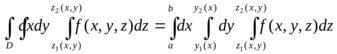 Все свойства для двойных интегралов справедливы для тройных интегралов (доказательства аналогичные). Физический смысл тройного интеграла заключается в том, что если плотность вещества задана функцией f, то масса вещества в определенном объеме– это тройной интеграл функции f по этому объему.