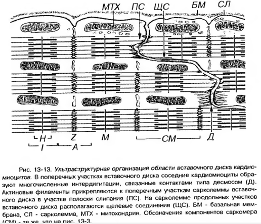 Вставочные диски осуществляют связь кардиомиоцитов друг с другом. Под свет микр- имеют вид попер или зигзагообр полосок, пересекающих функц волокно.