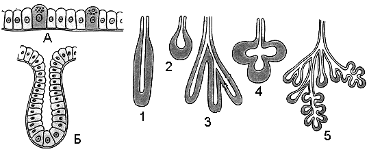 А – одноклеточные железы, Б – многоклеточные железы, 1 - 5 – типы многоклеточных желез
