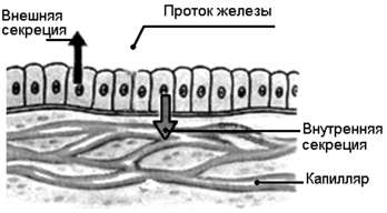 Железистые клетки приспособлены к синтезу, накоплению, хранению и выделению секрета. В цитоплазме гландулоцитов мощно развита ЭПС, комплекс Гольджи. Существует две группы желез: железы внутренней секреции, эндокринные, выделяющие секрет в кровь; и железы, выделяющие секрет во внешнюю среду, на поверхность кожи или в просвет полых органов, эти железы называются экзокринными (см. Рис. 6).