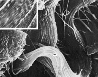 На врезке в углу фотографии – коллагеновые фибриллы при большем увеличении имеют периодическую исчерченность.