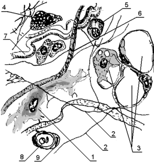 8 – капилляр, 9 – перицит.