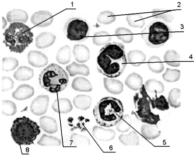 7 – сегментоядерный нейтрофил; 8 - базофил,