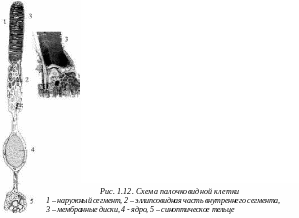 есто выхода зрительного нерва называется слепым пятном, так как не содержит светочувствительных элементов. Палочки и колбочки имеют наружный сегмент, состоящий из мембранных дисков и внутренний сегмент, содержащий эндоплазматическую сеть и митохондрии. Наружный сегмент составляет светочувствительную часть. В мембране дисков содержится зрительный пигмент родопсин, в состав которого входит белок и альдегид витамина А. Родопсин разлагается под влиянием света с изменением ионной проницаемости мембран и возникновением электрического сигнала в следствие гиперполяризации рецепторов. Родопсин регенерирует в темноте в результате энергоемкого процесса.