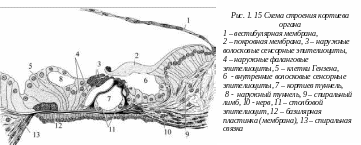 Спиральный (кортиев) орган образован рецепторными сенсорно-эпителиальными (волосковыми) клетками и разнообразными опорными клетками.