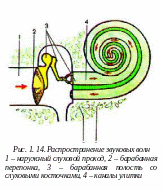 Рецепция звука обеспечивается сложными механизмами. Звуковые волны вызывают колебания барабанной перепонки, которые приводят в движение слуховые косточки, передающие их на перилимфу и базилярную мембрану. Колебания последней, усиленные в участках улитки, содержащих струны определенной длины, приводят к деформации стереоцилий волосковых клеток, погруженных в покровную мембрану. При этом возникает электрический потенциал, который передается на окончания дендритов биполярных клеток спирального ганглия, их аксоны образуют улитковый нерв. Более 90% афферентных нервных волокон подходят к внутренним волосковым клеткам, а к значительно более многочисленным наружным клеткам – лишь 10%.