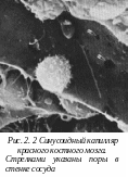Стенка капилляров очень тонкая, тем не менее, в ней отчетливо различают два слоя: наружный, состоящий из перицитов и базальной мембраны и внутренний - эндотелиальный. Эндотелий - пласт вытянутых, полигональной формы клеток с извилистыми границами (длиной 175-75 мкм, а толщиной от 20 нм на периферии, и до 3-5 мкм в околоядерной области). Вдоль внутренней и наружной поверхностей различимы пиноцитозные пузырьки. Органеллы развиты слабо. Внутренняя поверхность эндотелиоцита может иметь микроворсинки. Эндотелиоциты капилляров почечных клубочков, кишечной ворсинки, эндокринных желез имеют локальные истончение цитоплазмы или фенестры. В капиллярах других органов (селезенки, печени) между эндотелиоцитами обнаруживаются щели, а базальная мембрана в этих участках прерывистая. Базальная мембрана - тонкофибриллярная структура, в которой можно выделить три слоя: светлую, прозрачную пластинку, плотную пластинку и сетчатую пластинку. Перициты, клетки Руже, располагаются между листками базальной мембраны. Фибриллярные структуры в перицитах не обнаружены, что свидетельствует о том, что перициты не участвуют в изменении просвета капилляра. Однако, они играют важную роль, являясь малодифференцированными, адвентивиальными клетками, в регенерации и росте капилляра.