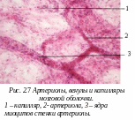 ри малом увеличении на препарате «Артериолы, венулы и капилляры мозговой оболочки» найдите капилляры, артериоллы и венулы. Рассмотрите их при большом увеличении и зарисуйте. Отметьте эндотелий, в стенке артериол - гладко мышечные элементы.