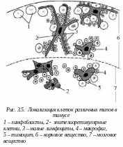 имфоидных органов, где Т-лимфоциты созревают в суб-классы: киллеры, хелперы, супрессоры. В периферических лимфоидных органах протекает антигензависимая дифференцировка Т-лимфоцитов. Из тимуса в циркуляцию выходят только те Т-лимфоциты, которые приобрели рецепторы к чужеродным антигенам. Лимфоциты, которые имеют рецепторы к собственным антигенам погибают в самом тимусе, не выходя в кровоток. Если же такие лимфоциты попадают в циркуляцию, развивается аутоиммунная реакция. Лимфоциты мозгового вещества обладают очень низкой митотической активностью и представляют собой циркулирующий пул Т-лимфоцитов, т.е. они могут выходить из мозгового вещества, заходить в периферические органы и возвращаться обратно.