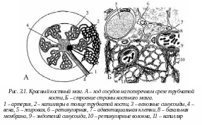 трому красного костного мозга составляет ретикулярная ткань, обладающая низкой пролиферативной активностью. В ней также присутствуют макрофаги, адипоциты и клетки эндоста, образующие выстилку костных полостей. Строма красного костного мозга пронизана множеством кровеносных сосудов обычного микроциркуляторного русла и венозными синусами. Синусы выстланы тонким эндотелием, базальная мембрана на большем протяжении отсутствует.