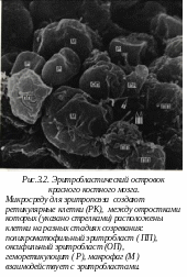 Эритропоэз у млекопитающих протекает в эритробластических островках. Эритробластические островки представляют собой морфофункциональные единицы красного костного мозга. В центре островка находится центральный макрофаг, диаметр макрофага больше диаметра эритробласта в 1,5 раза. Вокруг центрального марофага в несколько слоев располагаются эритробласты на разных стадиях созревания. Центральные макрофаги выполняют следующие функции: поглощение выброшенных ядер эритробластов; фагоцитоз поврежденных клеток и перенос железа в виде ферритина в цитоплазму развивающихся эритробластов путем микропиноцитоза.