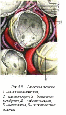 азальная мембрана, которая сливается с базальной мембраной эндотелия капилляра, становясь единым образованием - альвеолокапиллярной мембраной. Цитоплазма респираторного эпителиоцита, альвеолокапиллярная мембрана, цитоплазма эндотелиоцита - аэрогематический барьер, осуществляющий газообмен.