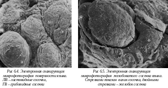 1 – желобовидные сосочки, 2, 3 – нитевидные сосочки, 4 – грибовидные сосочки, 5 – спинка языка, 6 – боковая поверхность языка,