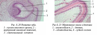 При малом увеличении рассмотрите «Развитие зуба». Найдите эмалевый орган эмаль, дентин, зубной сосочек.
